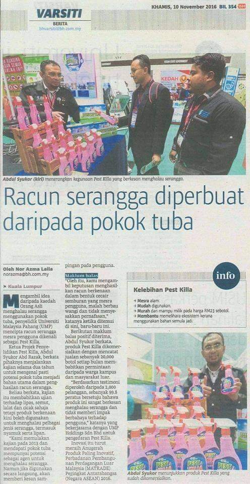 Mengambil idea daripada kaedah Orang Asli menghalau serangga menggunakan pokok tuba, penyelidik Universiti Malaysia Pahang (UMP) mencipta racun serangga mesra pengguna dikenali sebagai Pest Killa.