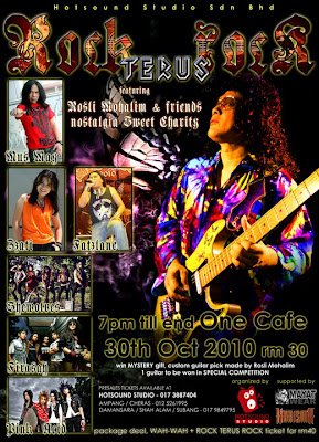 Cuma ada satu sebab sahaja kenapa aku pergi gig ini.ROSLI MOHALIM.Aku masih lagi belum berpeluang tengok beliau perform live sama ada bersama SWEET CHARITY atau pun secara solo.Sebenarnya pada mulanya aku agak berbelah bagi untuk pergi gig ini kerana keesokkan harinya aku kena bangun seawal pagi untuk balik kampung,tapi kerana excited aku untuk melihat aura ROSLI MOHALIM,aku gagahi jua untuk pergi.Aku sampai di One Cafe jam 7.30pm dan masih lagi soundcheck,so aku pergilah menunaikan apa yang patut di tunaikan.Sebenarnya band-band yang bermain malam itu agak asing sebenarnya bagi aku,so reviewnya pun ala kadar sahaja.